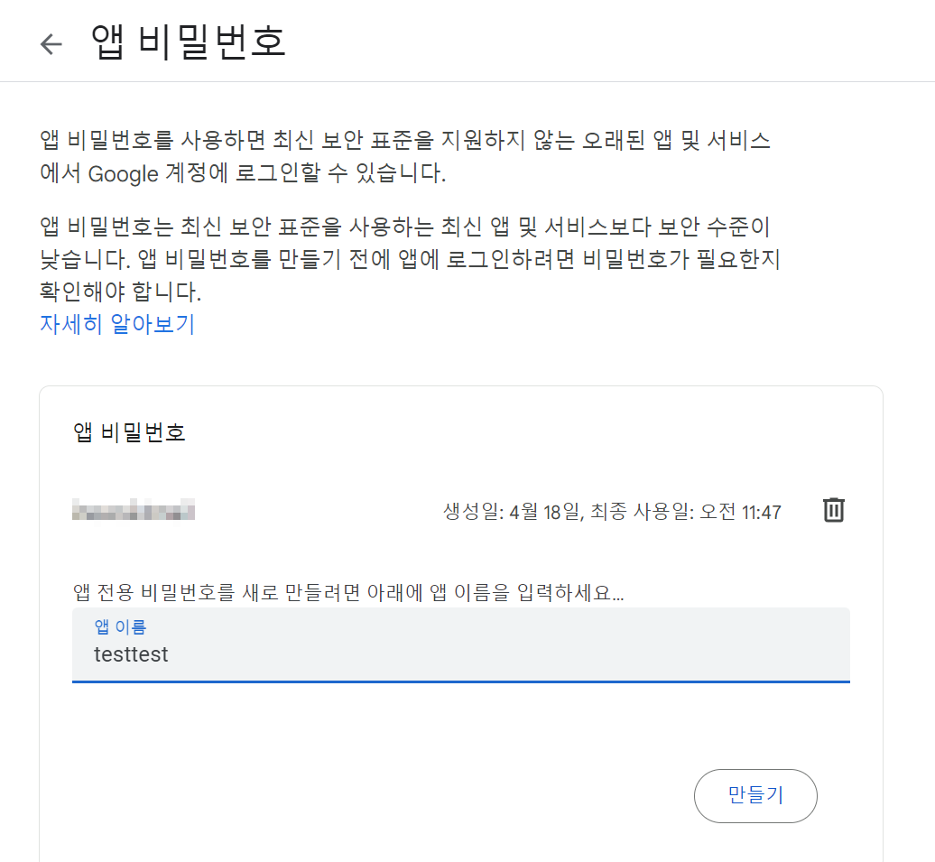 - 앱비밀번호를 등록하면 된다